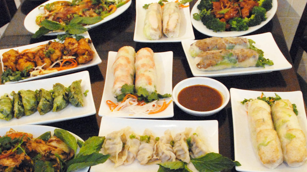 Fried tofu, vegetable dumplings, and vegetable spring rolls.